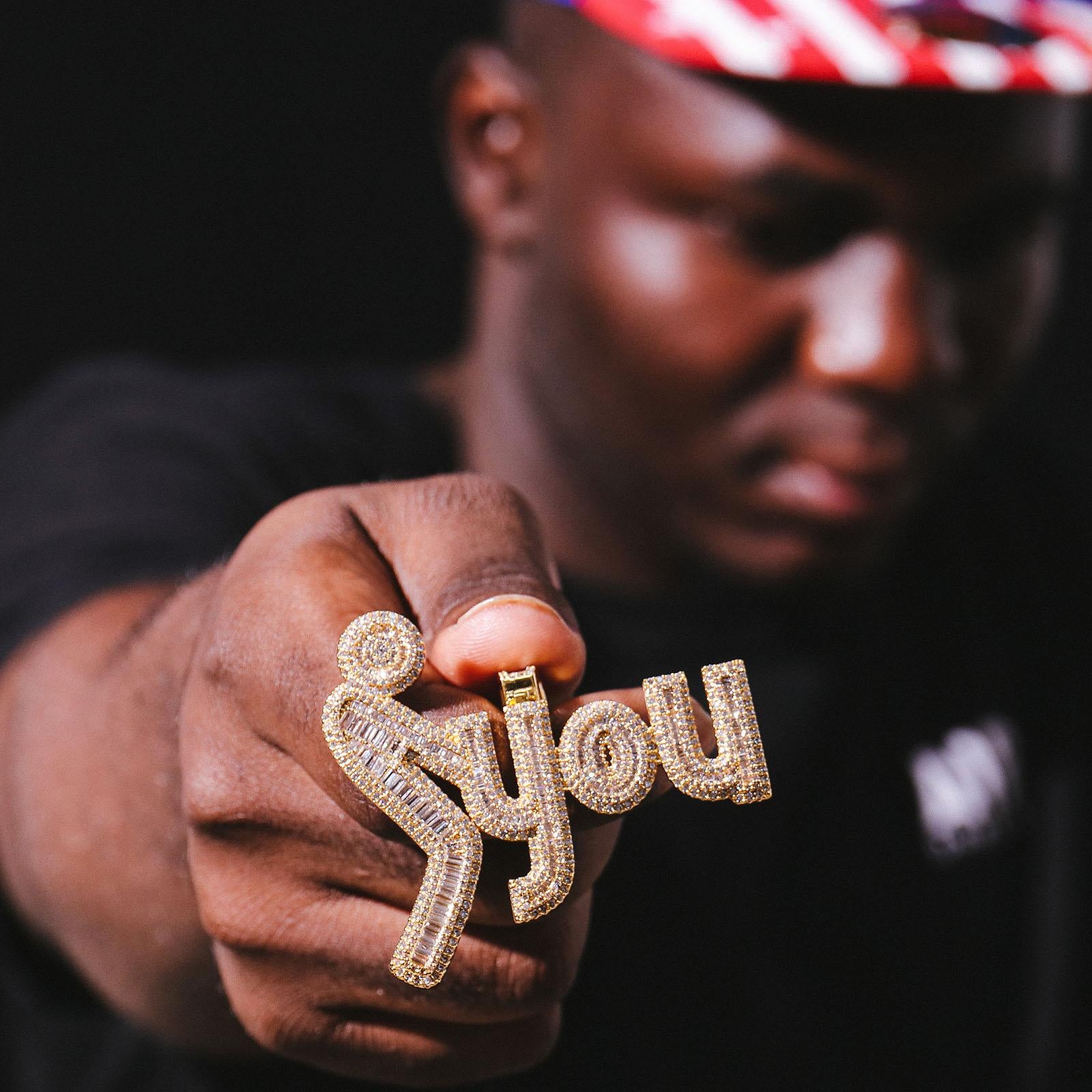 A pendant with the phrase 'F you' written in a cursive-like font, adorned with yellow gold and silver accents, with a large moissanite gemstone in the center.